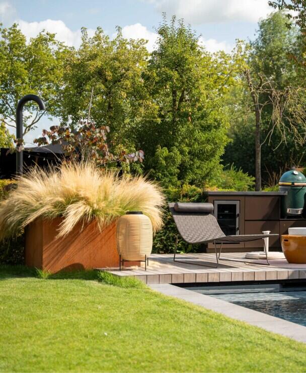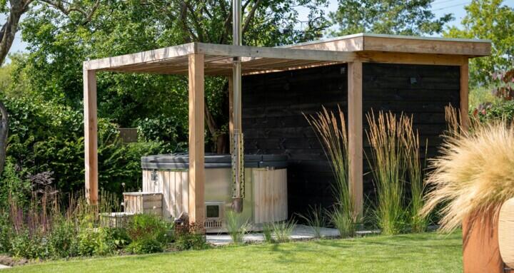 Maar daar blijft het niet bij. Deze tuin beschikt ook over een prachtig zwembad en hottub van Serena Spa, voor de ultieme ontspanning op zomerse dagen. En wat is er nu heerlijker dan na een frisse duik opwarmen onder de luxe buitendouche?